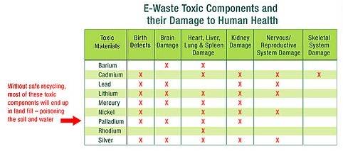 Mercury- Mercury has a toxic affect on both human and environment health. A small amount of it exists in CFLs, televisions and in refrigeration units. When the said e-waste is dumped into the landfills and water bodies the elemental form of mercury gets easily transferred into local environments.